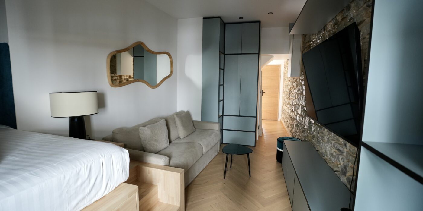 La pièce de vie s’organise autour d’un espace nuit légèrement surélevé avec lit double, offrant confort et intimité. Un coin salon avec canapé et télévision pour profiter de moments de détente après une journée à la plage ou en ville.
